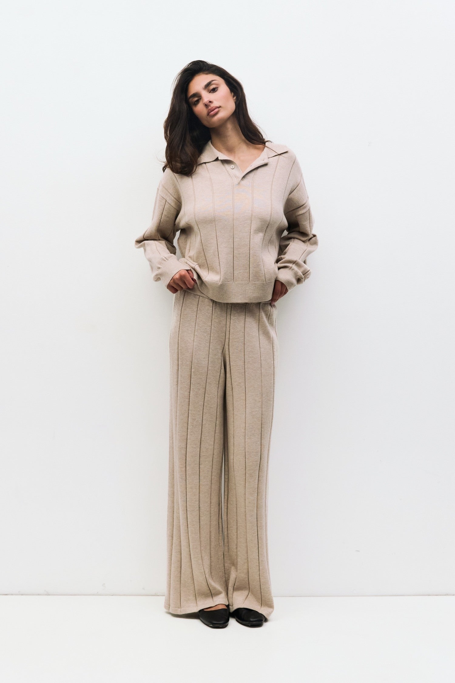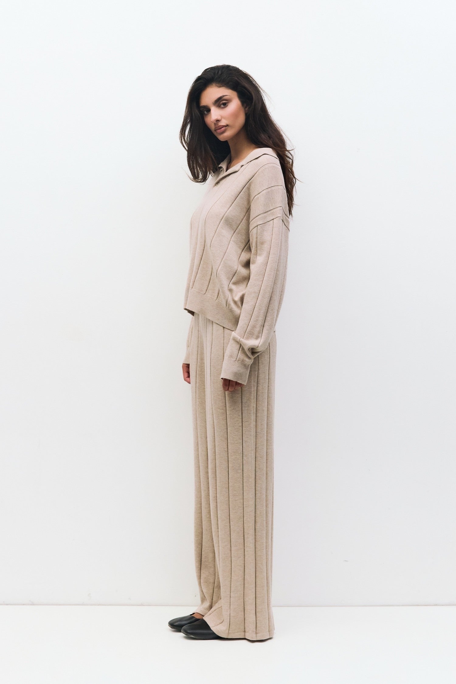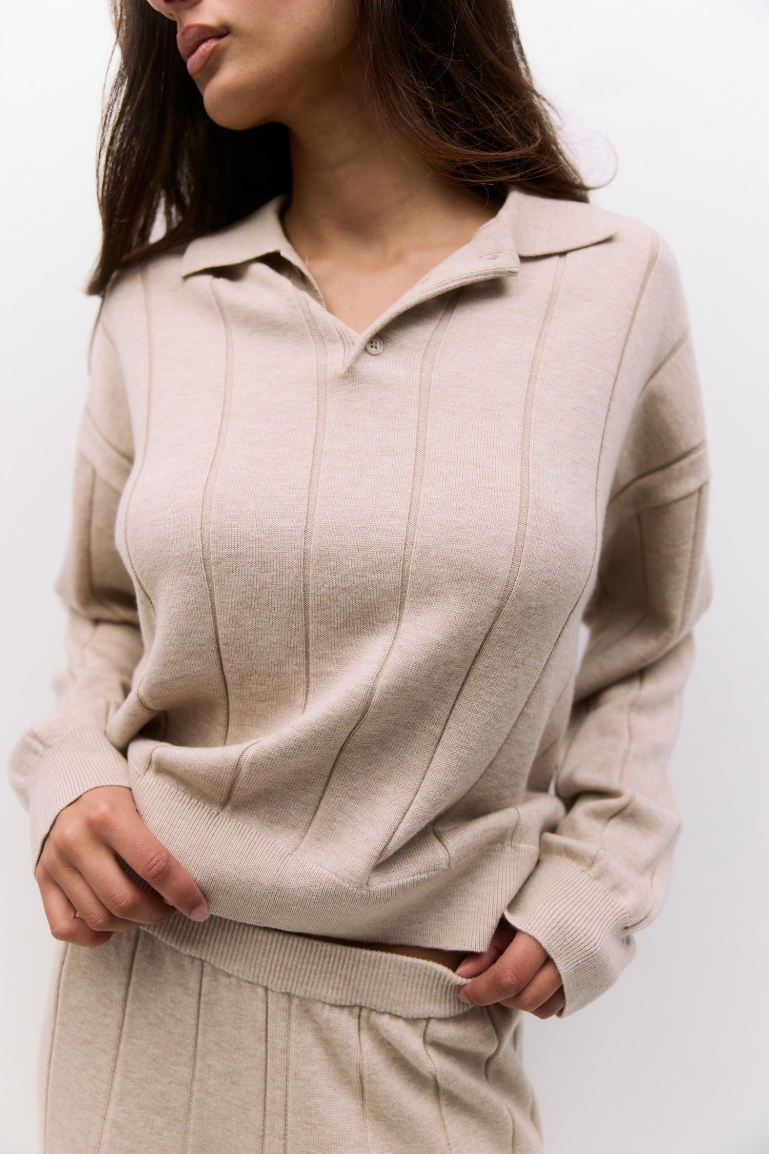 a softly structured knit, defined by a wide rib and an easy, relaxed silhouette. its shape is framed by a polished polo neckline and a discreet partial placket. finished with refined rib trims, it balances comfort and clarity. pair with the Lennon Pant for an elevated uniform.